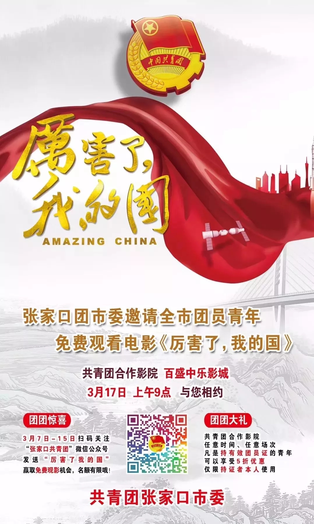 3月17日,团市委邀请了团员青年代表300多人在共青团合作影院——百盛中乐影城免费观看了电影《厉害了,我的国》,一起感受祖国十八大以来的巨大变化和取得的辉煌成就,凝聚大家的民族自豪感和荣誉感,引导广大团员青年积极投身到张家口“完成三大历史任务,交出两份优异答卷”的工作中,为张家口的发展注入青春的活力。