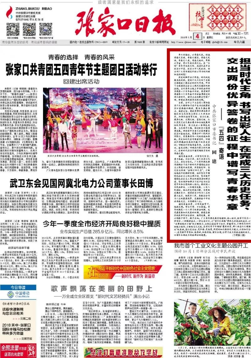 5月4日,市委书记回建在《张家口日报》刊发署名文章《担当时代主角 书写出彩人生 在完成三大历史任务、交出两份优异答卷的征程中谱写青春华章》,深情寄语全市广大青年,衷心希望广大青年继承和弘扬“五四”精神,在奋斗中释放青春激情、追逐青春梦想,在完成三大历史任务、交出两份优异答卷的征程中,创造出无愧于时代、无愧于青春的辉煌业绩,开创张家口更加美好的明天!