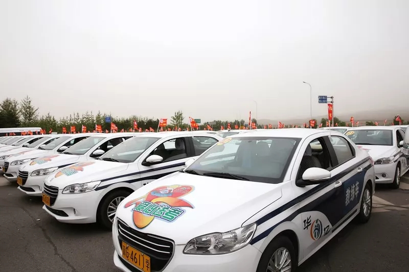 宇通大巴车5辆,金龙电车2辆,标致301及捷达63辆,共计70辆。每辆车插有爱心送考小红旗,机器盖上统一贴有“爱心送考”标识。