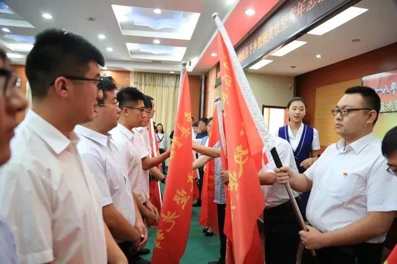 ▲参会领导为脱贫攻坚青年志愿者先锋队代表授旗